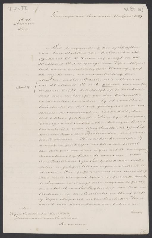 Begeleidende missive aan de gouverneur van de bestuurder bij stukken Vande kolonisten, uitleggende mede naar aanleiding van missiven van de gouverneur dat de kolonisten een bestaan kunnen vinden in de landbouw of in dienst hetzij van een... - D H 824-153