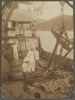 Gasboeien op het dek van een schip aan de steiger te Bandjermasin