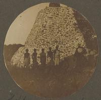 Bouwen van een steenpiramide voor een lichtbaken op het eiland Semaoe bij Timor