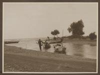 De monding van de Tjilamaja in de Tjiasem-baai met enkele prauwen