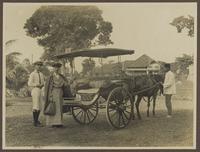 Mevrouw M.M. Raket, onderwijzeres, en G.E. Raket bij een sado, vermoedelijk te Batavia