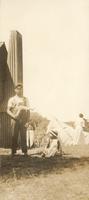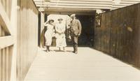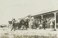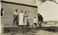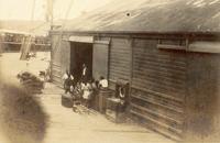 Europeanen bij een gebouw, vermoedelijk te Waianau in Nieuw-Zeeland