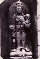 Beeld van een mensfiguur met twee kinderen in het museum te Modjokerto