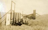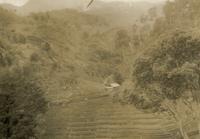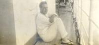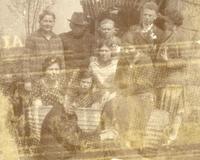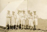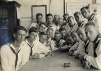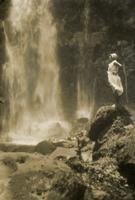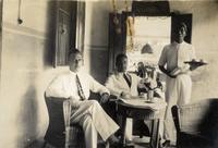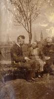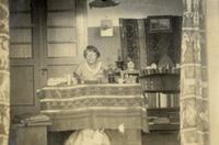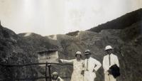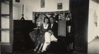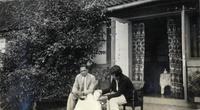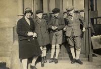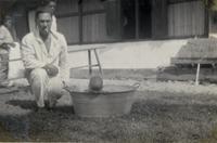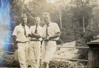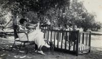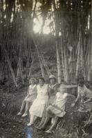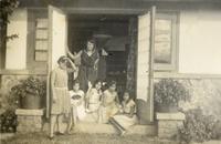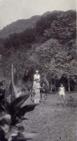 KITLV A1399 - De schrijfster Beb Vuyk met haar zoons Hans en Ru voor hun huis op de plantage te Boeroe