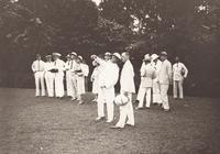 Medewerkers, waaronder inspecteur ingenieur V. R. van Romondt (midden) van de Oudheidkundige Dienst vieren terugkeer van adjunct-inspecteur P. H. van Coolwijk (rechts) na zijn verlof te Prambanan