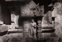 Europeaan bij de voet van een hoofdtempel met waterspuiers van het Tjandi-complex Loro Djongrang bij Prambanan