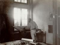 Interieur van het oude kantoor van de Oudheidkundige Dienst te Prambanan met medewerker