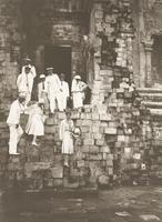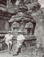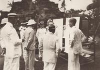 Europeanen bezoeken een gerestaureerde tempel, vermoedelijk door de Oudheidkundige Dienst op Midden-Java