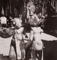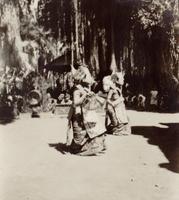 Ni Pollok en Ni Tjibloen (rechts) dansen de legong in Kedaton te Denpasar