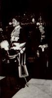 Sultan Hamangkoe Boewono VII van Jogjakarta verlaat samen met de resident van Jogjakarta, de heer Westra in een gouden koets de galareceptie ter ere van H.M. de Koningin te Cheribon