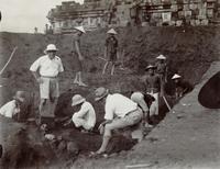 Opgraven van een stenen kistje op het terrein van het Tjandi-complex Loro Djongrang bij Prambanan in aanwezigheid van adjunct-inspecteur P. H. van Coolwijk (staand met tropenhelm)