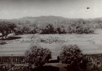 Uitzicht over de velden vanaf het tempelterrein te Prambanan