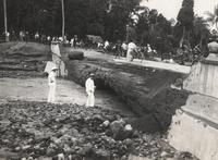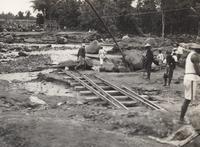 Opgegraven waterleiding in de buurt van Prambanan, onder begeleiding van twee medewerkers van de Oudheidkundige Dienst, inspecteur ingenieur V. R. van Romondt (links) en adjunct-inspecteur P. H. van Coolwijk (rechts)