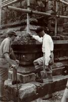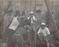 Onderzoek naar de inhoud van de tempelput van de Nandi-tempel van het Tjandi-complex Loro Djongrang bij Prambanan, onder begeleiding van twee medewerkers van de Oudheidkundige Dienst, inspecteur ingenieur V. R. van Romondt (midden) en adju...