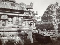 Prambanan-motief aan de voet van de hoofdtempel van het Tjandi-complex Loro Djongrang bij Prambanan met een medewerker van de Oudheidkundige Dienst, inspecteur ingenieur V. R. van Romondt