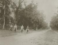 Vier Europese mannen te paard op de weg tussen Tjakranegara en Mataram