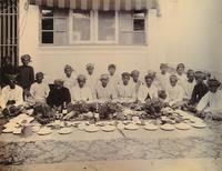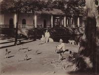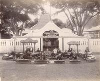 Europeanen voor een woning te Lali Djiwo met op de achtergrond de Ardjoeno