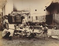 Vrouwen bezig met batik te Soerakarta